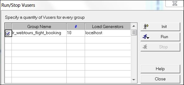 - Run/Stop Vusers: Using this button Run/Stop Vusers dialog box opens and you can add additional Vusers. Also, there are options to make Vuser’s state Initialize, Run or Stop.